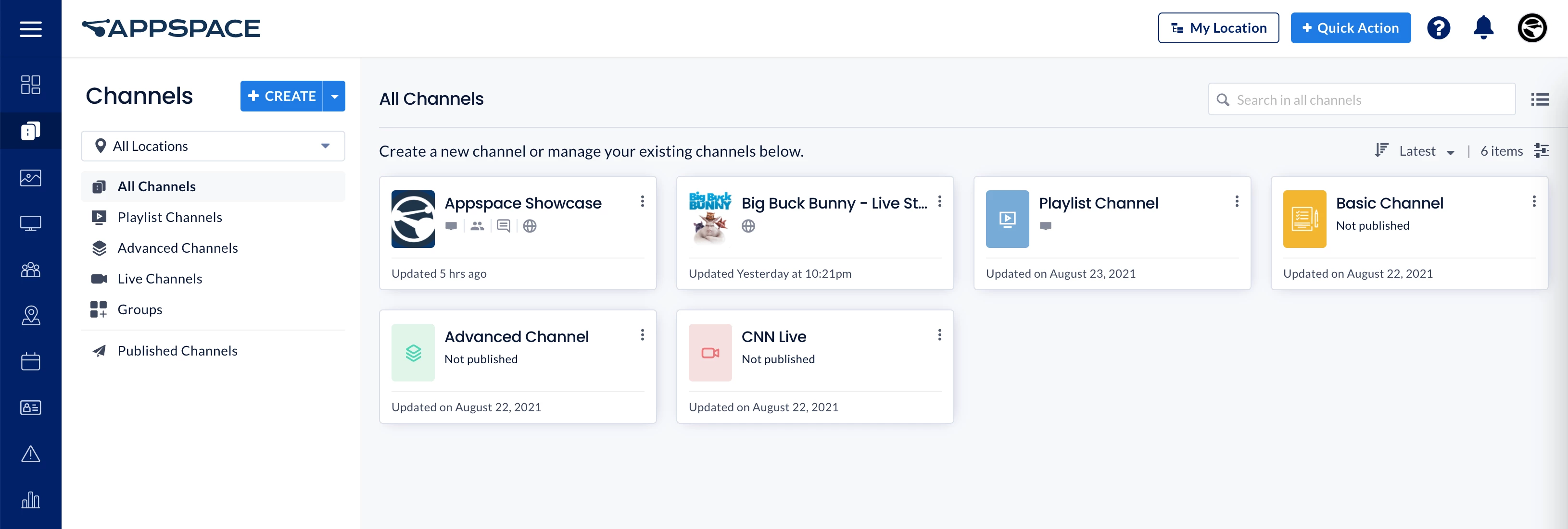 - Click the + Quick Action button from the Appspace navigation bar on top, and select Create Channel.