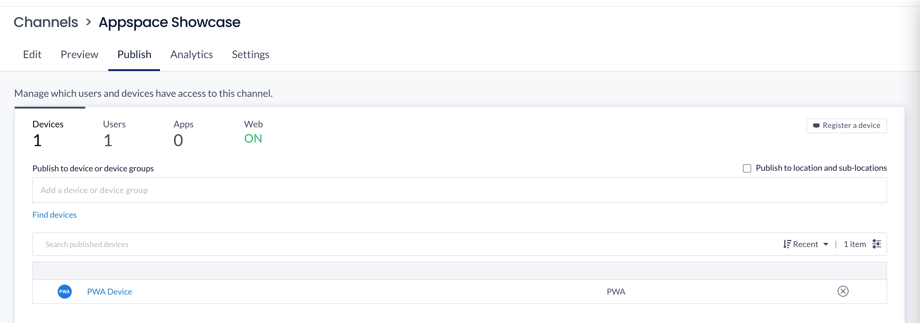 To publish the playlist channel to devices, users, apps, or to the web, click the Publish tab.