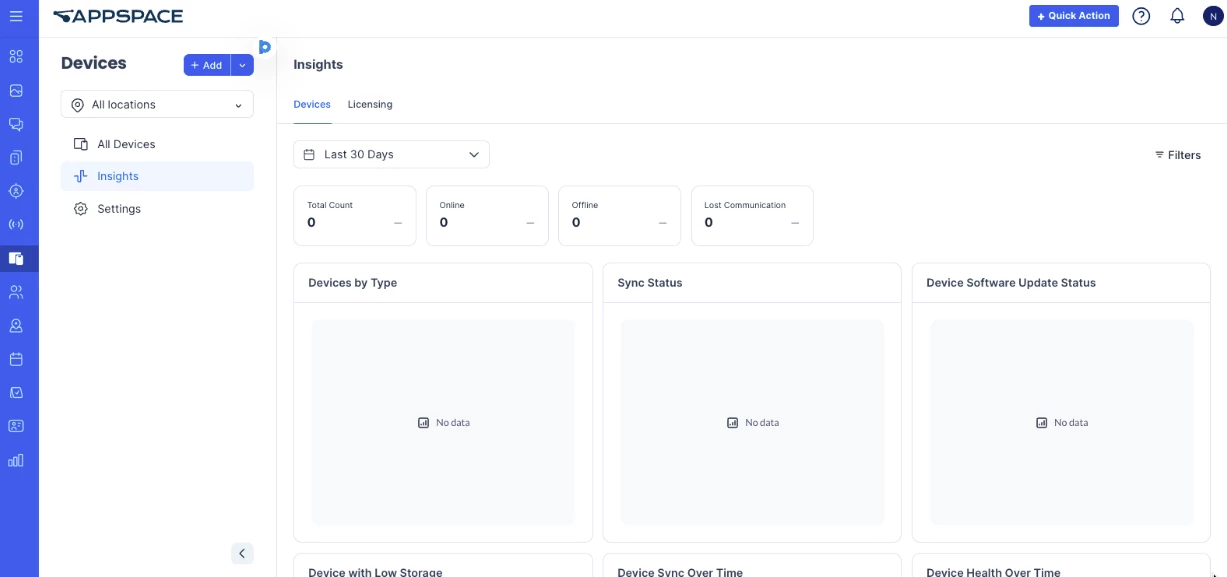 The following instructions explain how administrators can access and view the Device Insights dashboard in the Appspace console.