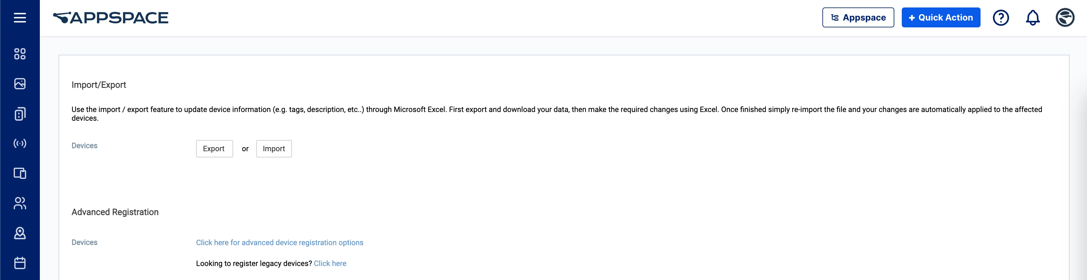 The Device page can be accessed by clicking the Appspace menu > Devices.