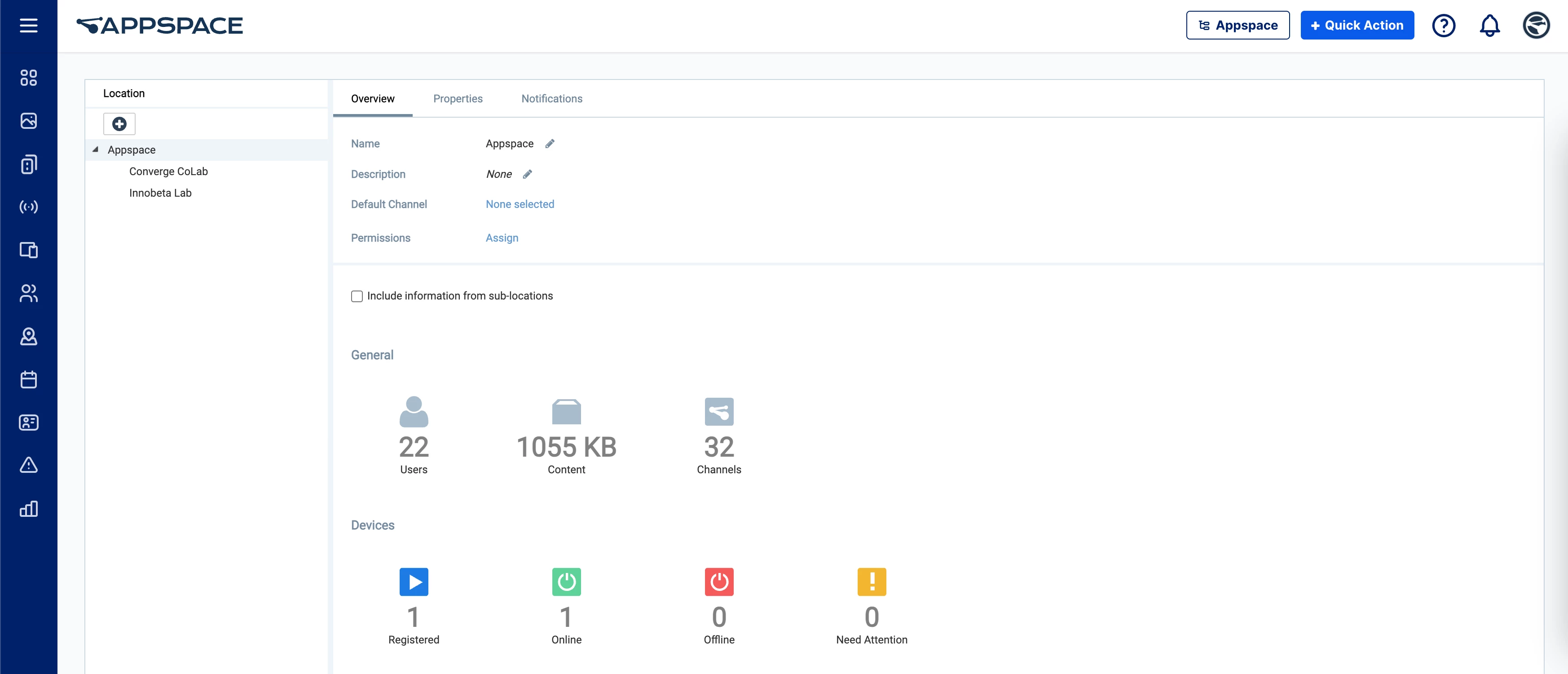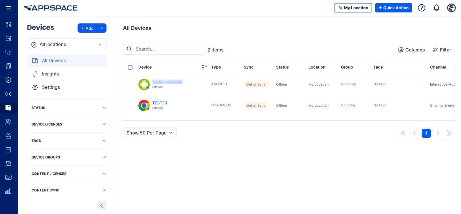 Users are now able to view and manage all devices registered to the Appspace platform, regardless of their assigned location (or sub-location), eliminating the need to switch locations from the navigation bar in order to view devices from different locations.