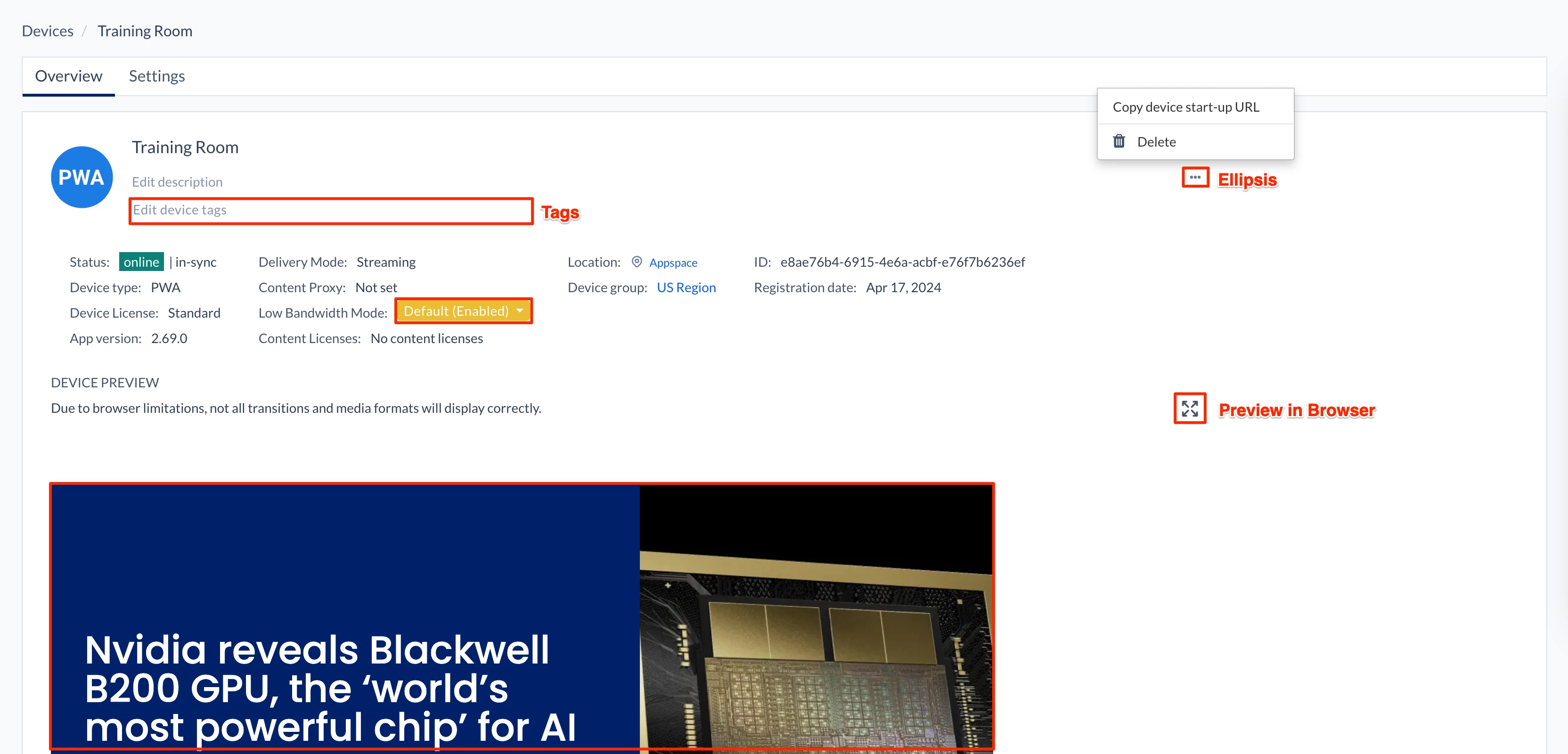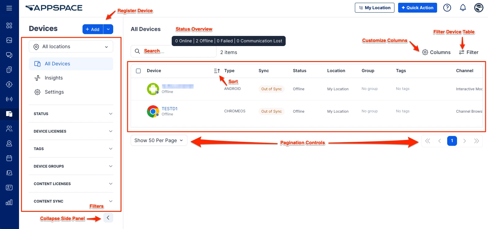 This article provides Administrators with an illustrative introduction to navigating the user interface and features available in the Devices module within the Appspace console.