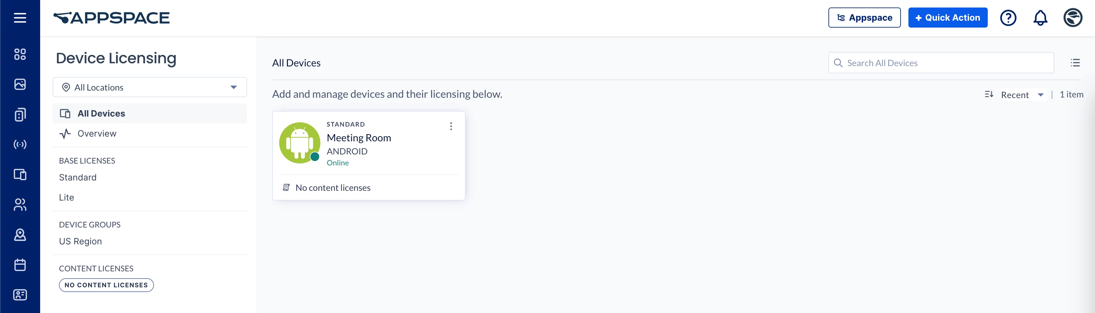 The Device Licensing page can be accessed by clicking the ☰ Appspace menu > Devices > Device Licensing.