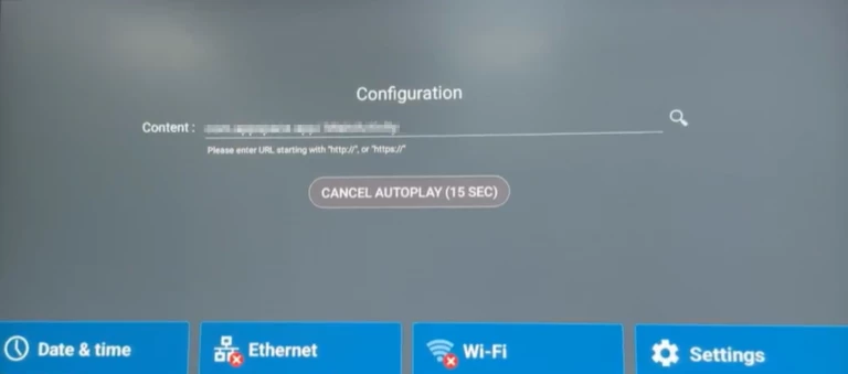 If the Qbic device has been configured previously, the device will attempt to autoplay the URL that has been configured in the Content content field, unless canceled.