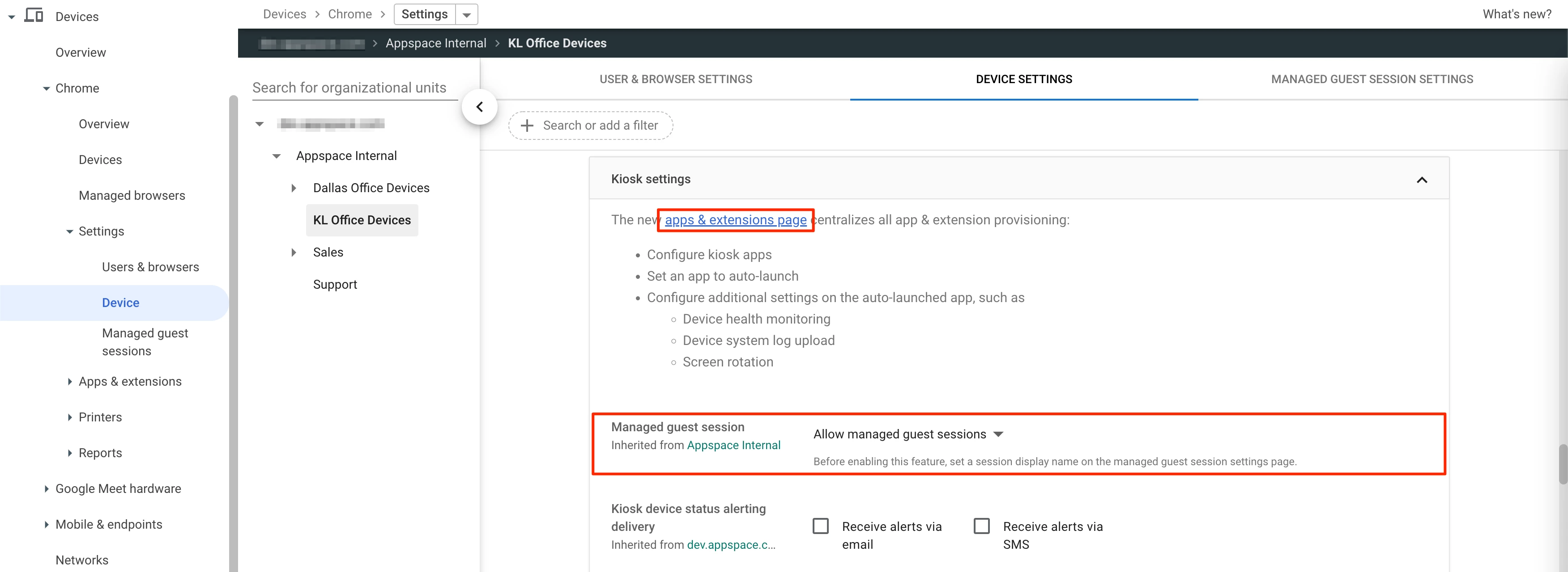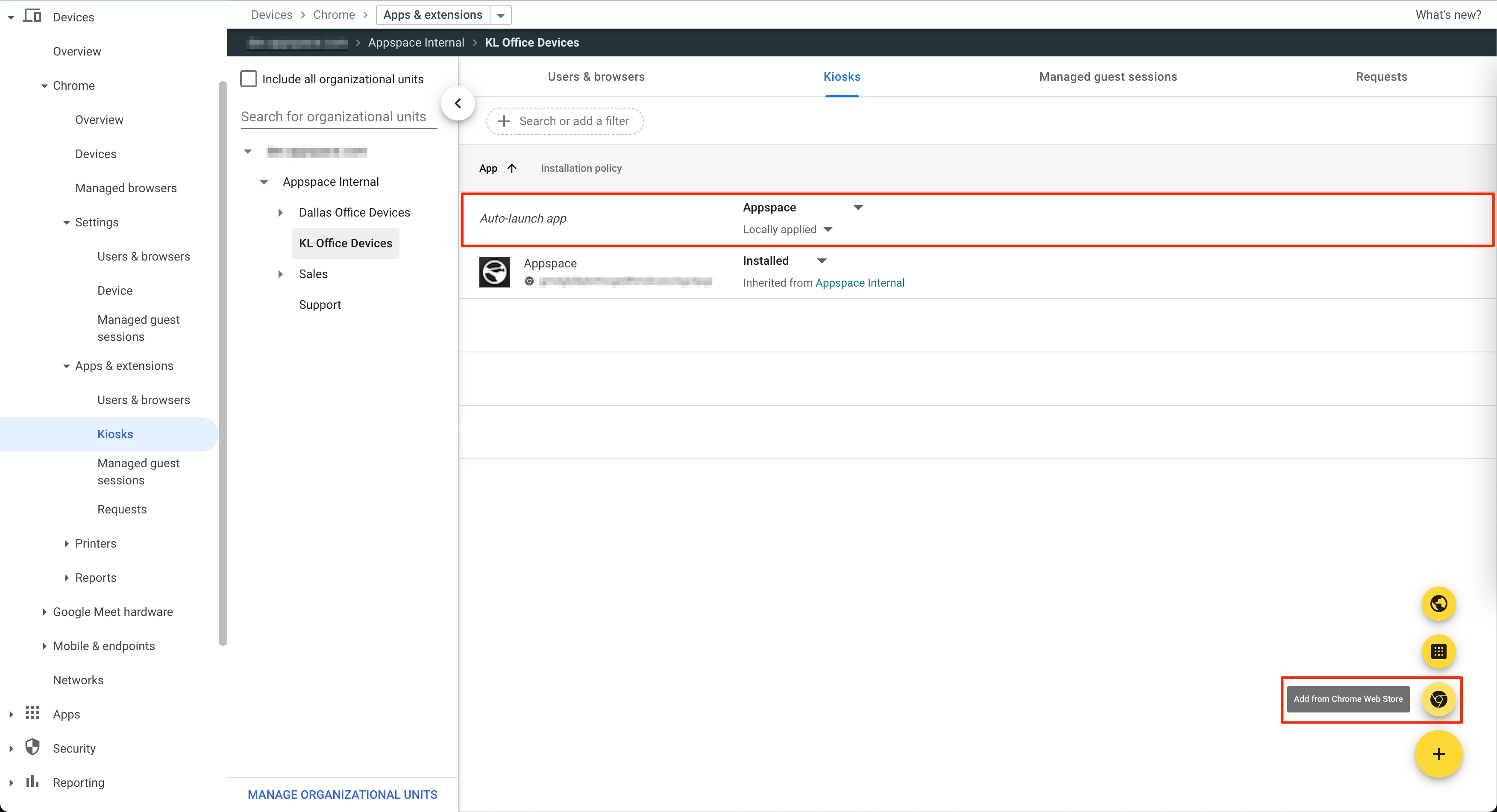 • Click the apps & extensions page link, and perform the following Kiosk configurations: