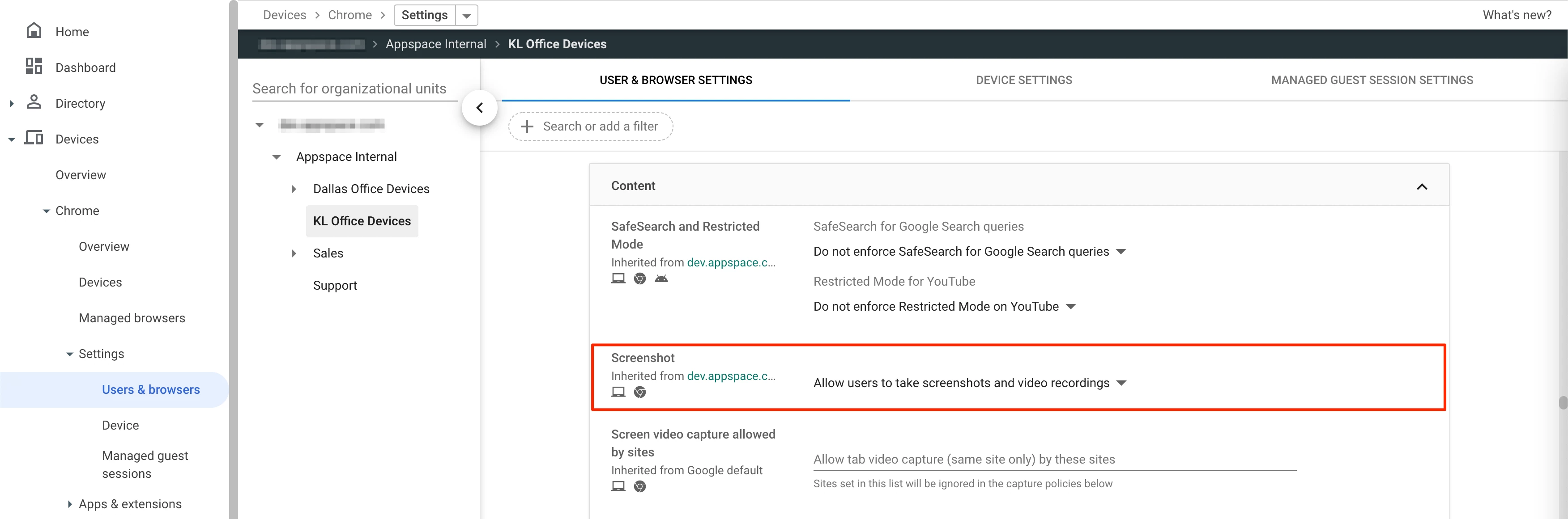 • Screenshot: Set to Allow users to take screenshots and video recordings.