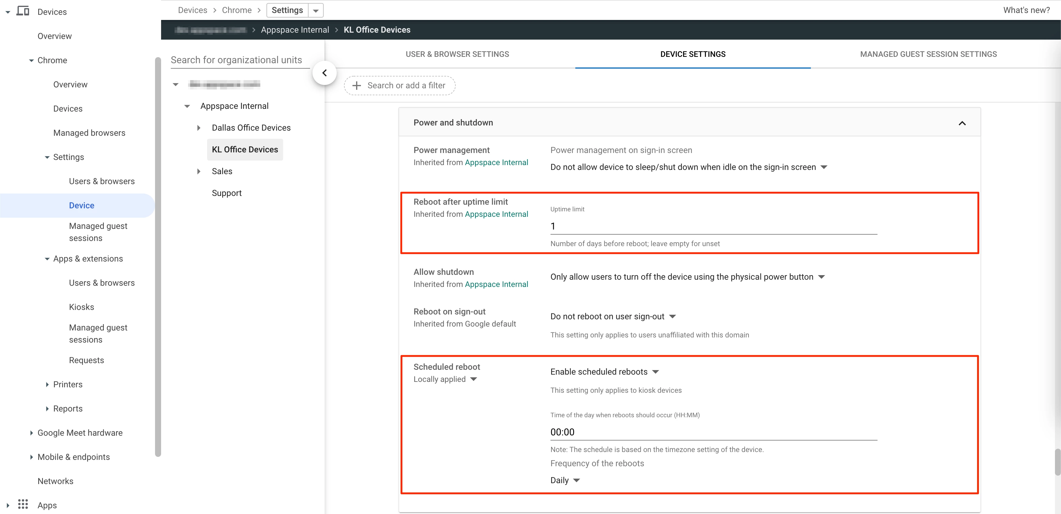 • Configure the DEVICE SETTINGS section as outlined in the Set ChromeOS Device Policies Google help article, with the specific configurations set below: