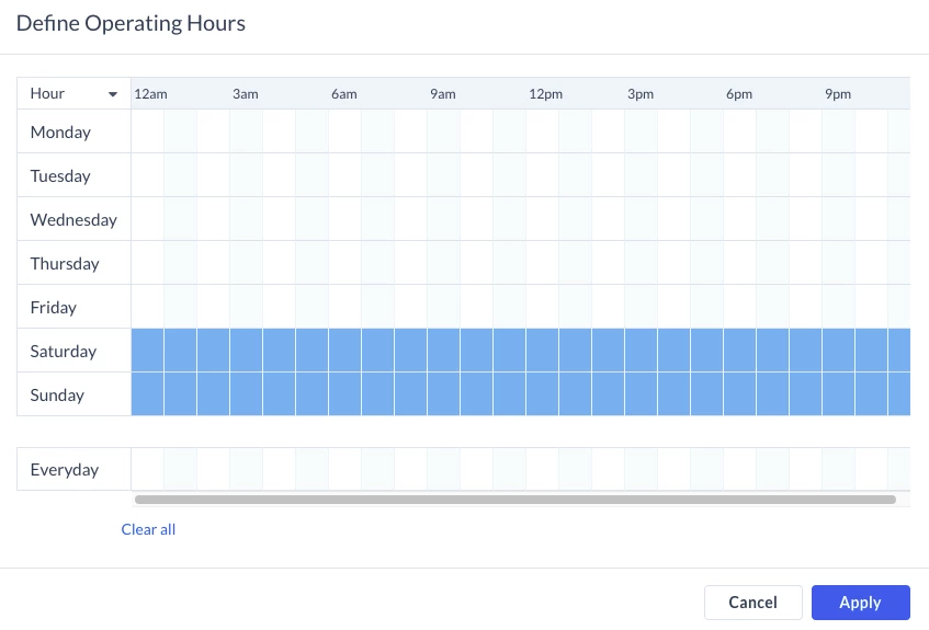 - Manual – Set custom hours; the user must define the operating hours. To do this, click Define Operating Hours. In Define Operating Hours, users can: