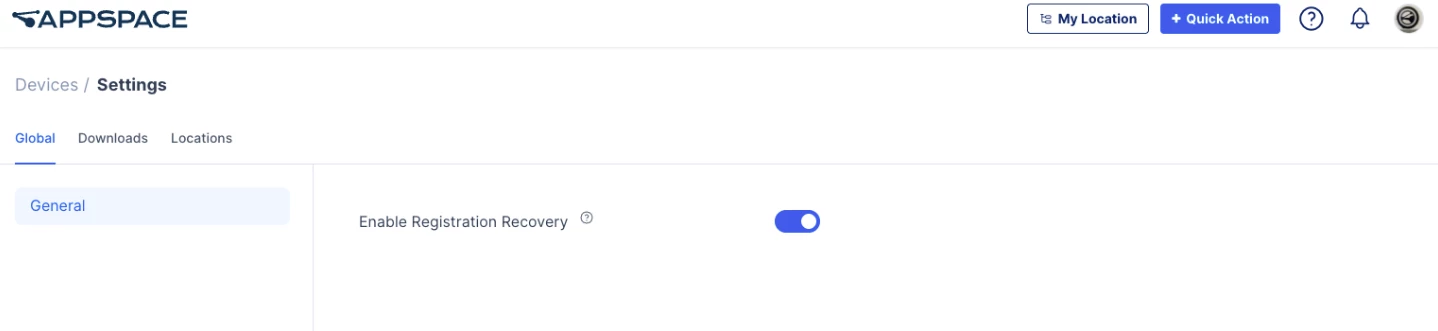 - In the Global > General, toggle the Enable Registration Recovery switch to ON to enable the Persistent Device Registration feature.