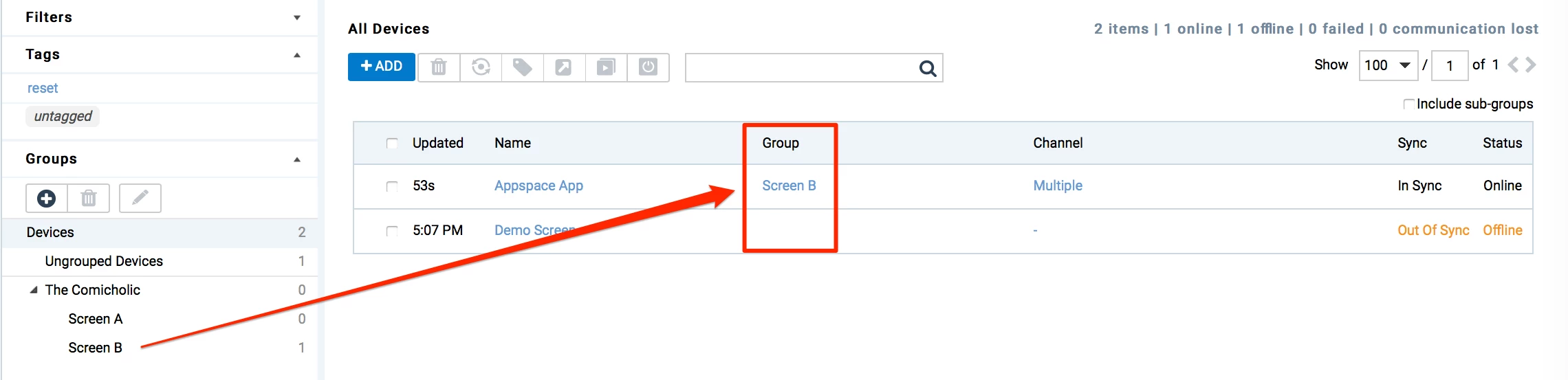 - Verify the selected device have been associated and grouped under the desired device group in the main device listings page.