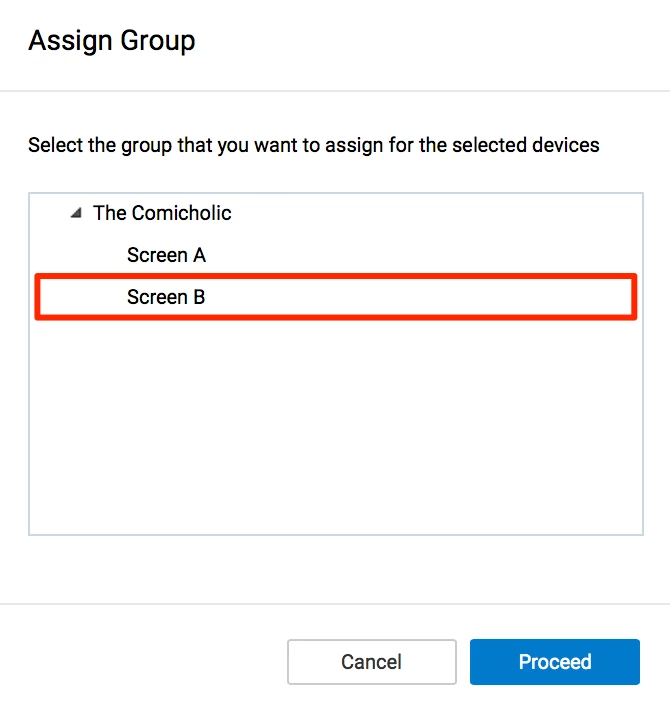 - In the Assign Group window, select the desired device group, and click Proceed.