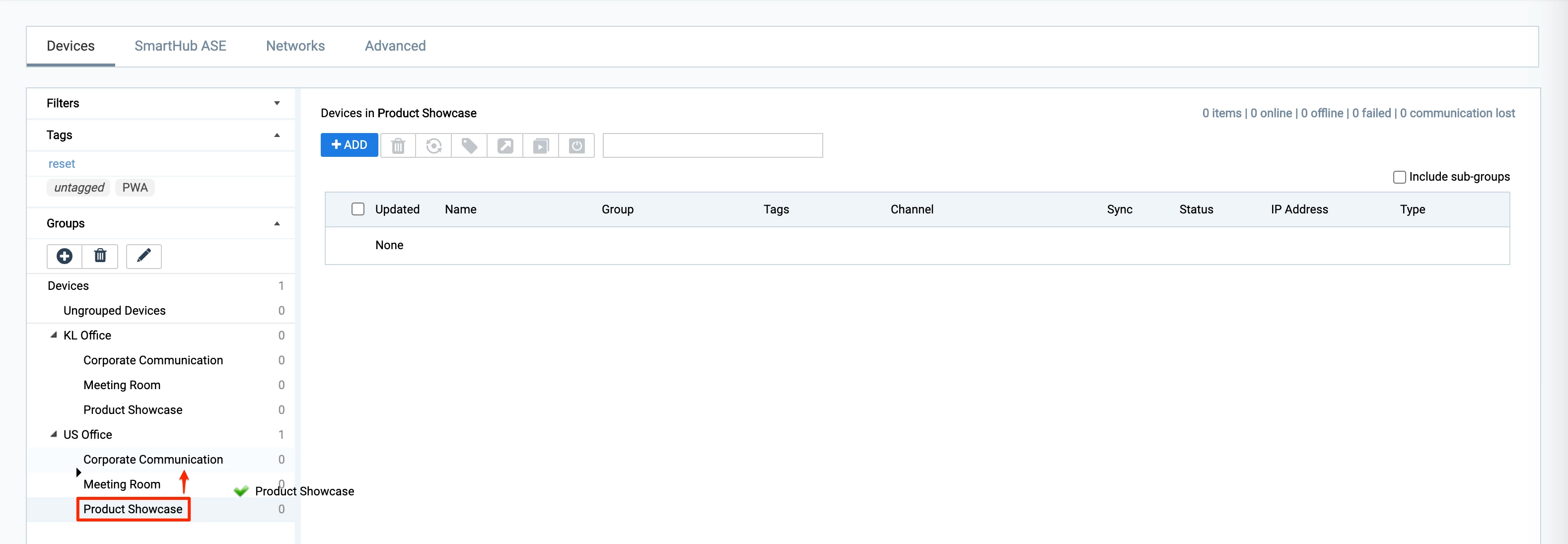 - Left-click your mouse and drag the device group to the new location in the Groups section.In the image below, the “Product Showcase” device group is being moved to be under the “Corporate Communication” device group.