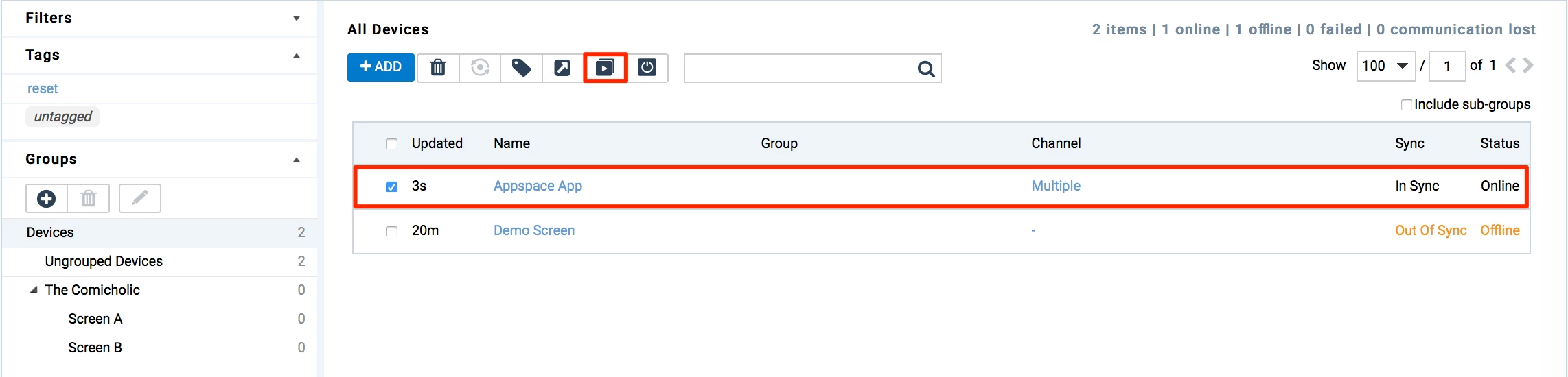 - Click Devices from the Appspace Menu navigation bar, and click the Devices tab.