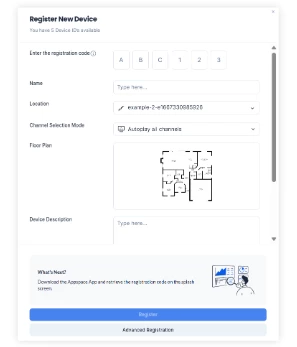 - In the Register New Device window, enter the registration code, device name, and channel selection mode.