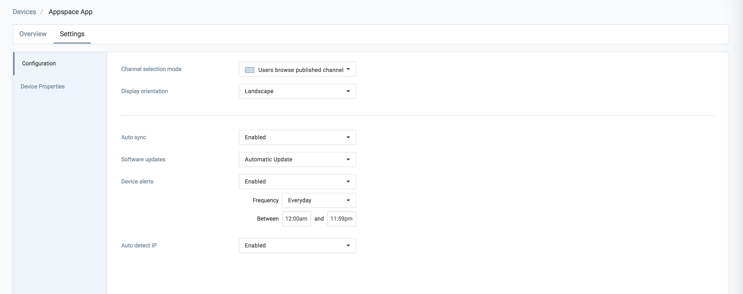 The Device Settings tab consists of the Configuration and Device Properties sections.