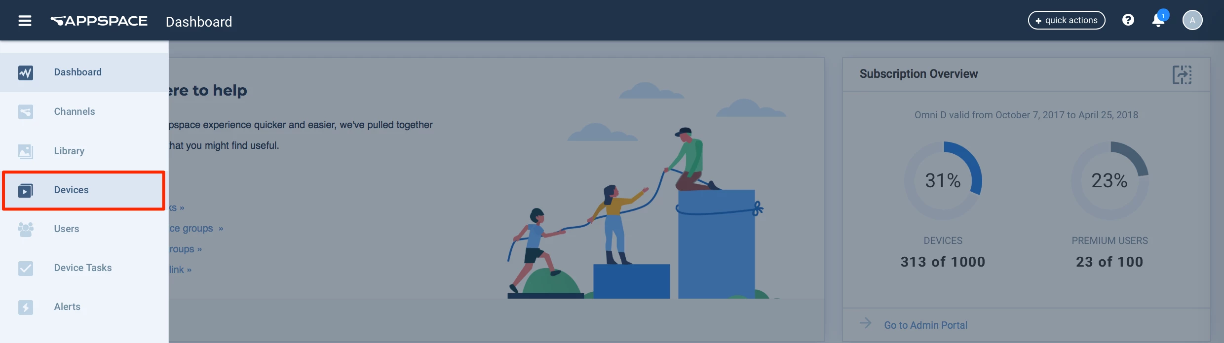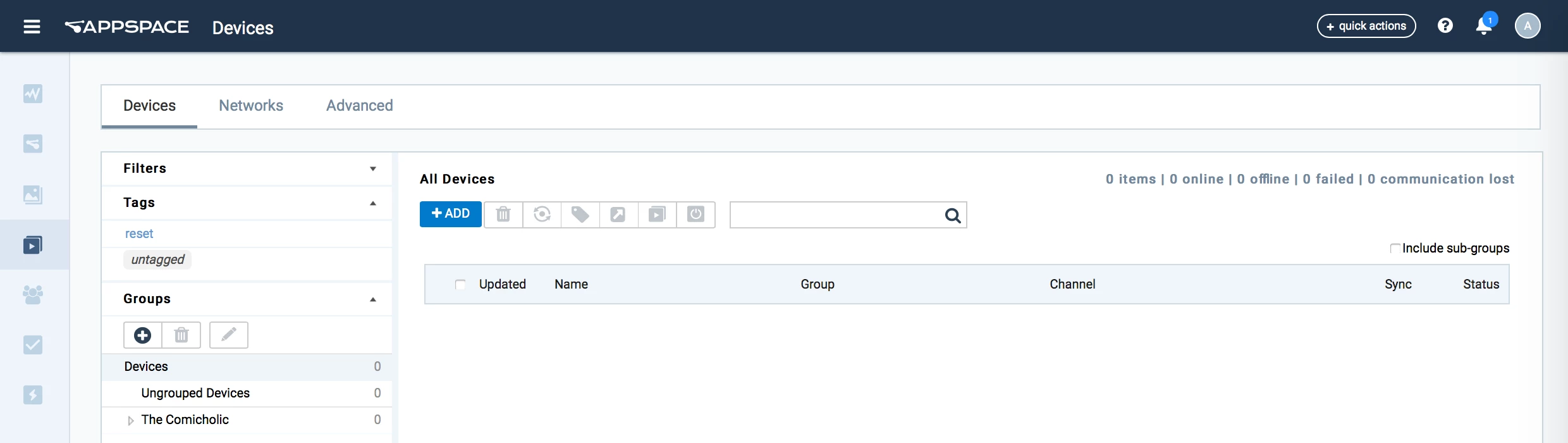 Register and organize your devices in device groups, or create and manage a hierarchy of networks, in Devices. Devices is accessed via the Appspace menu.