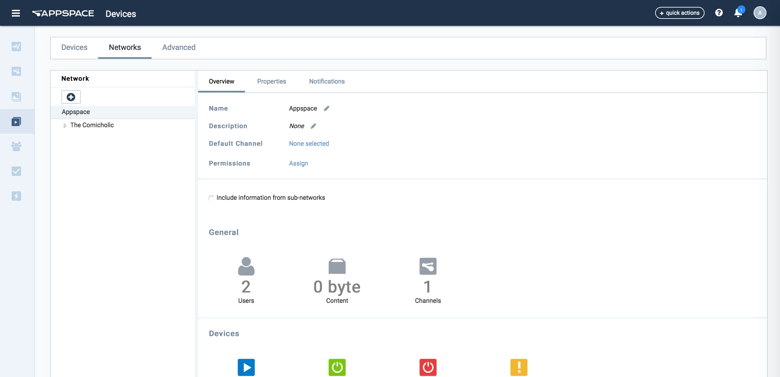 The Overview sub-tab displays the details of the selected network such as name, description, permissions, and the assigned channel. It also provides a graphical overview of information such as the total number of users, channels, registered devices, online devices, and offline devices, available in that network.