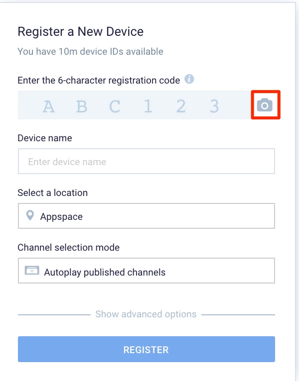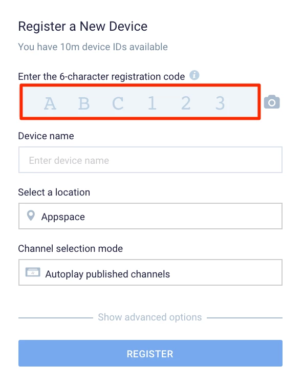 - Enter-in the 6-character registration code displayed on the Appspace App device registration screen.