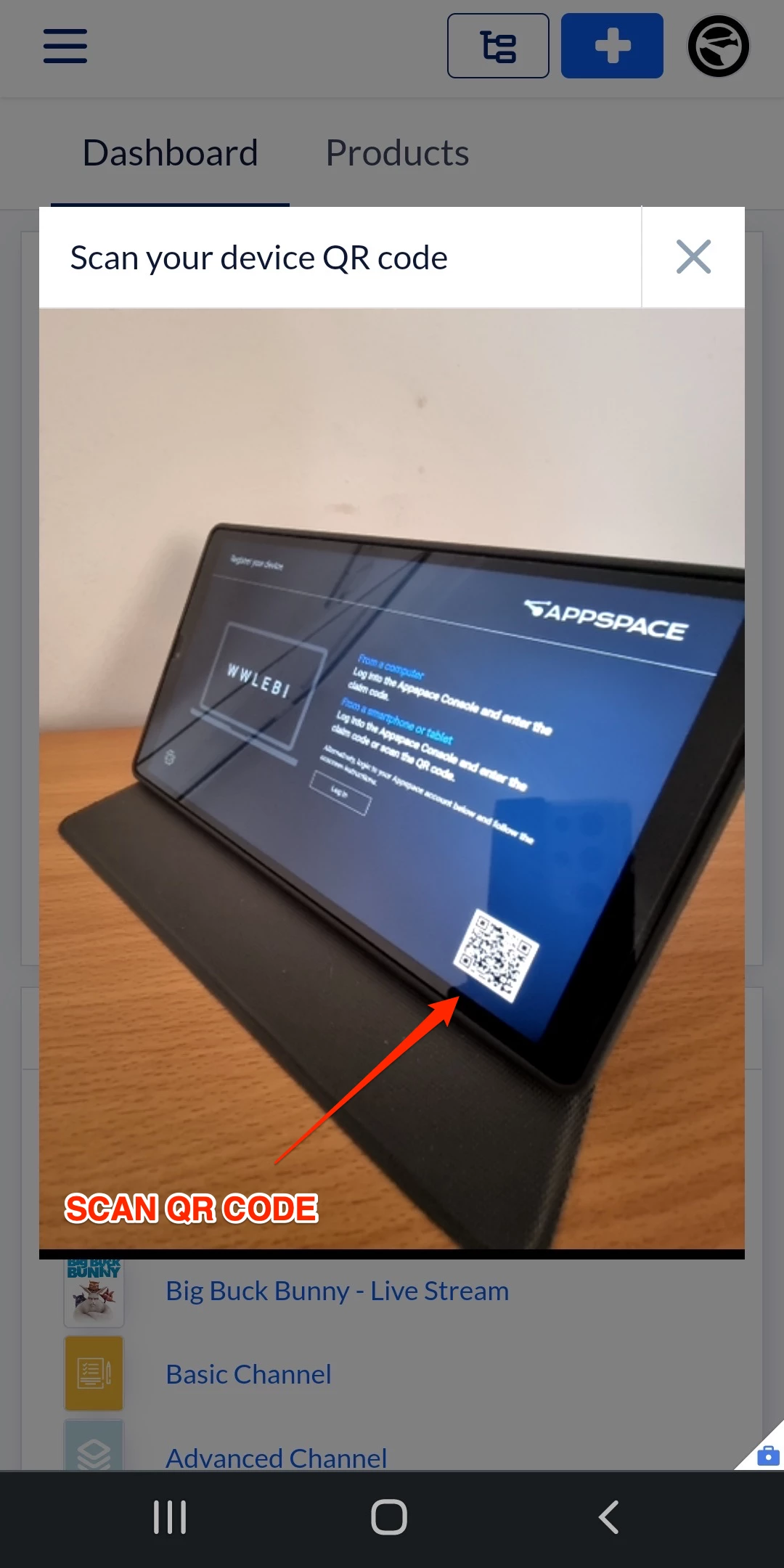 - Point the QR code scanner to the QR code on the Appspace App device splash screen. Once the QR code is in view, and scan is successful, you are returned to the Register a New Device window once again.