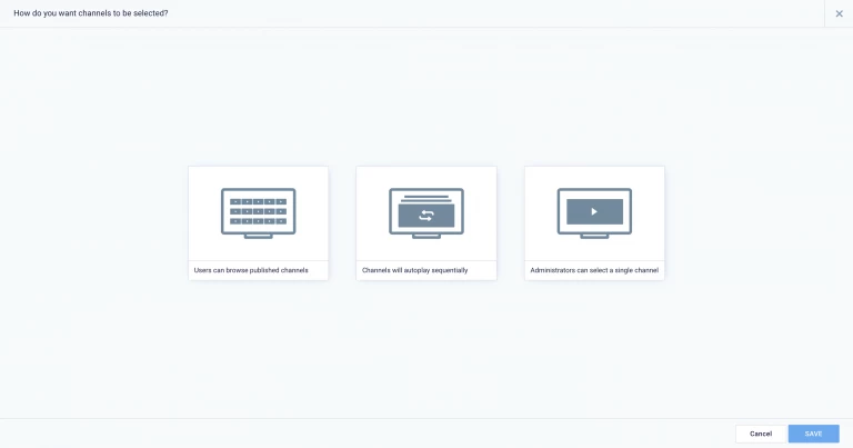 - Users browse published channels – this is the interactive mode or channel browsing mode, ideal for touch screen TVs or TVs with remote control, to display corporate content and enterprise tv, in any common space. When displaying the channel browsing mode, anyone can browse and play any content published to this device.While a Location Admin configures this setting, a Publisher must publish channels to the device and may assign any type of content, and channel type.