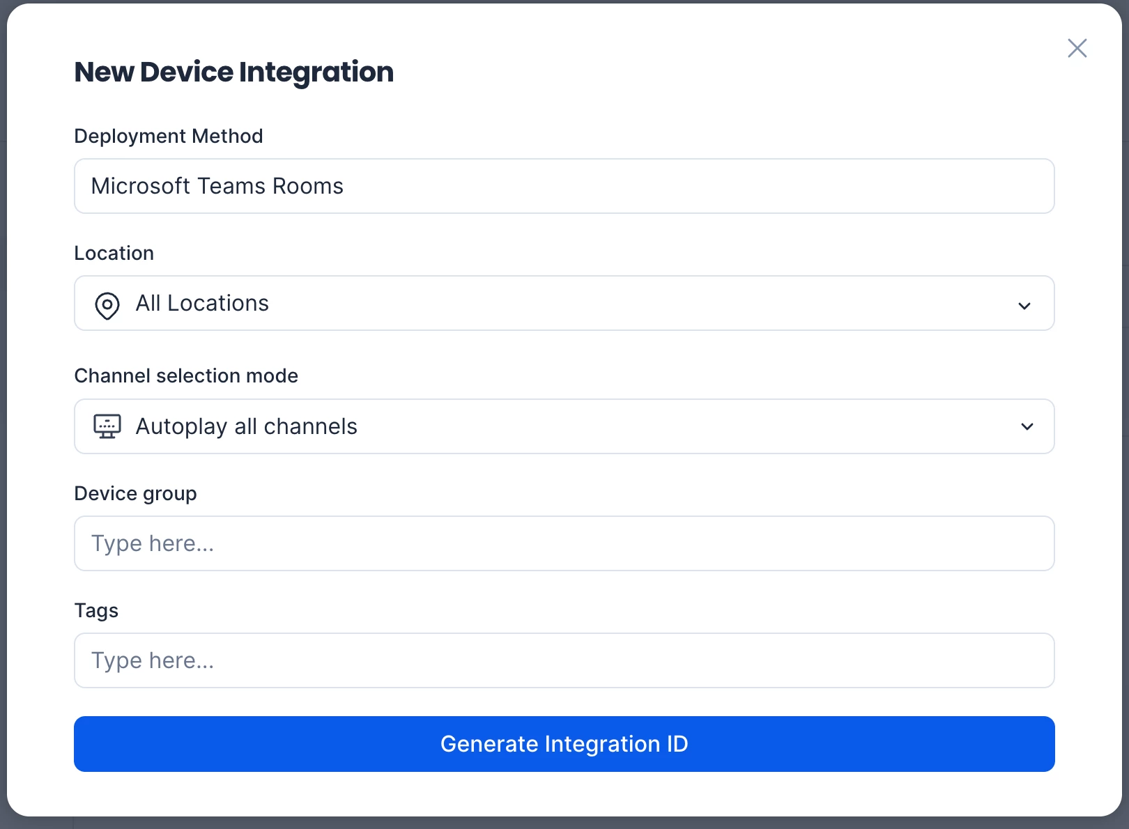 - Click the Generate Integration ID button to generate a unique ID, that will be copied and pasted into the Microsoft Teams Pro Management Portal (MTR PMP).