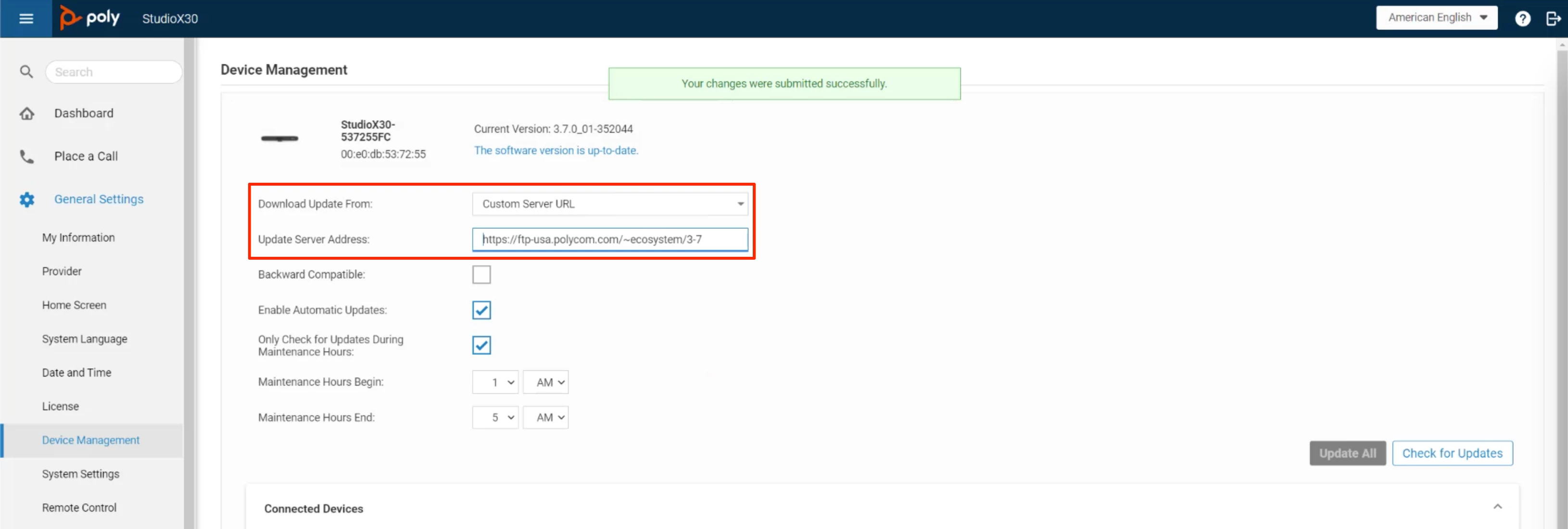 - To update the Poly device firmware, select Custom Server URL from the Download Update From drop-down menu, and enter the server URL that hosts the latest firmware update.