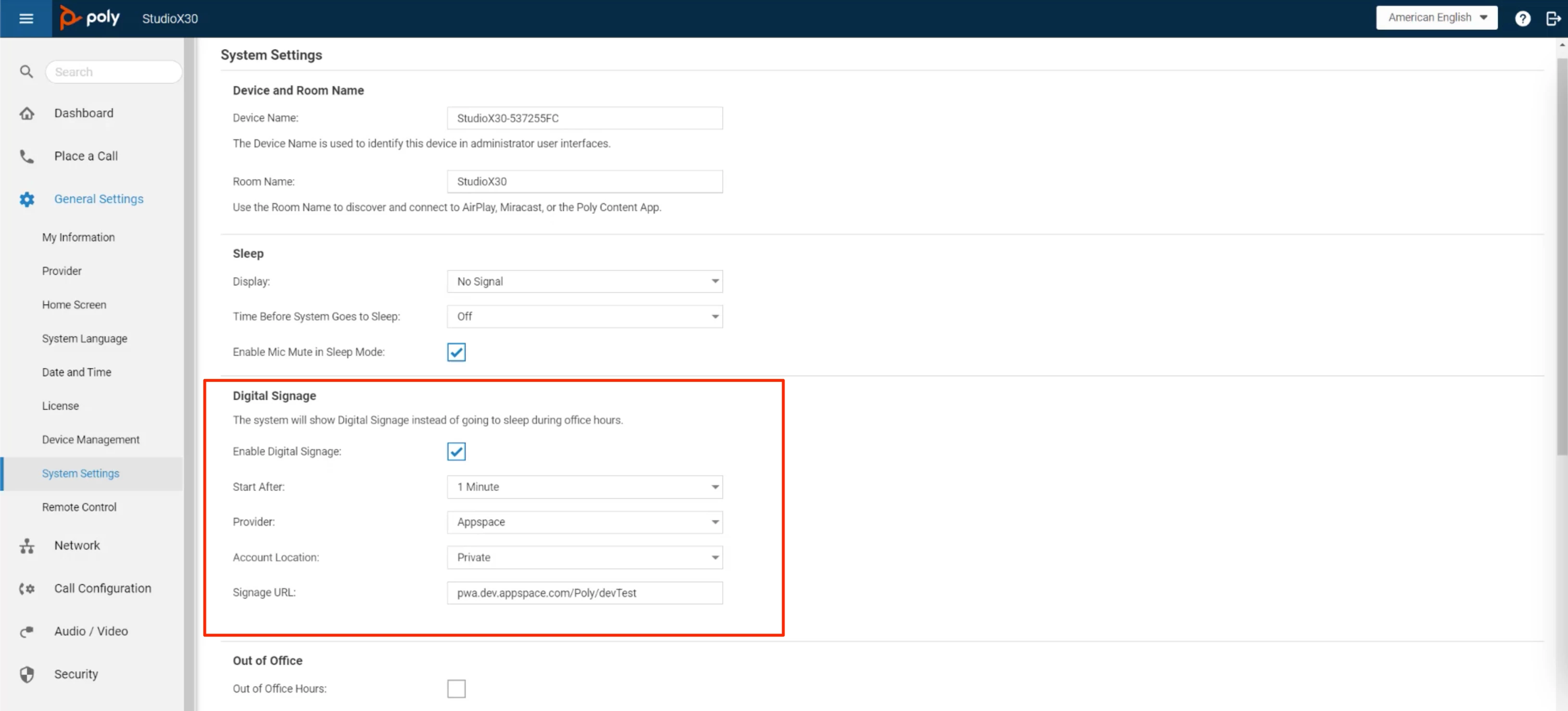 - To allow the device to turn off and conserve power please use the “Out of Office” setting in the Poly configuration to schedule the out of office power saving mode. This will shutdown signage and put the device to sleep.