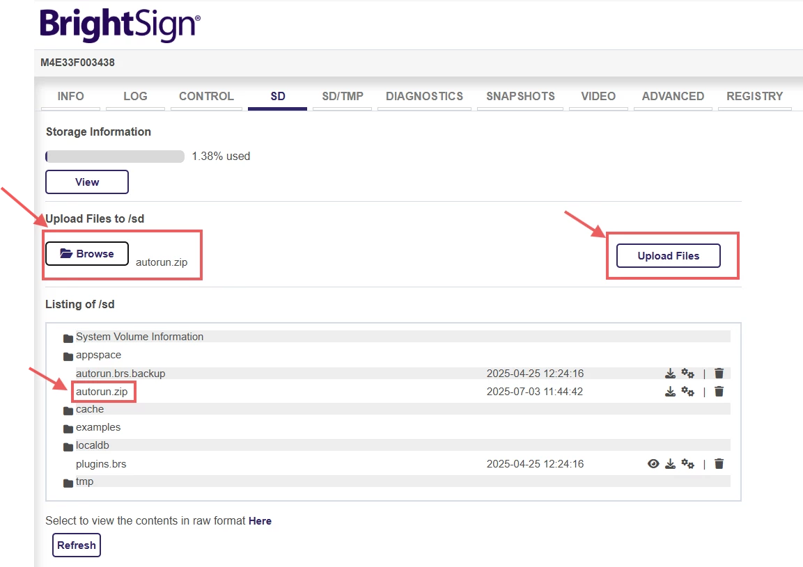 In the same /sd path, click the BROWSE button and pick the new autorun.zip. Click UPLOAD FILES button.