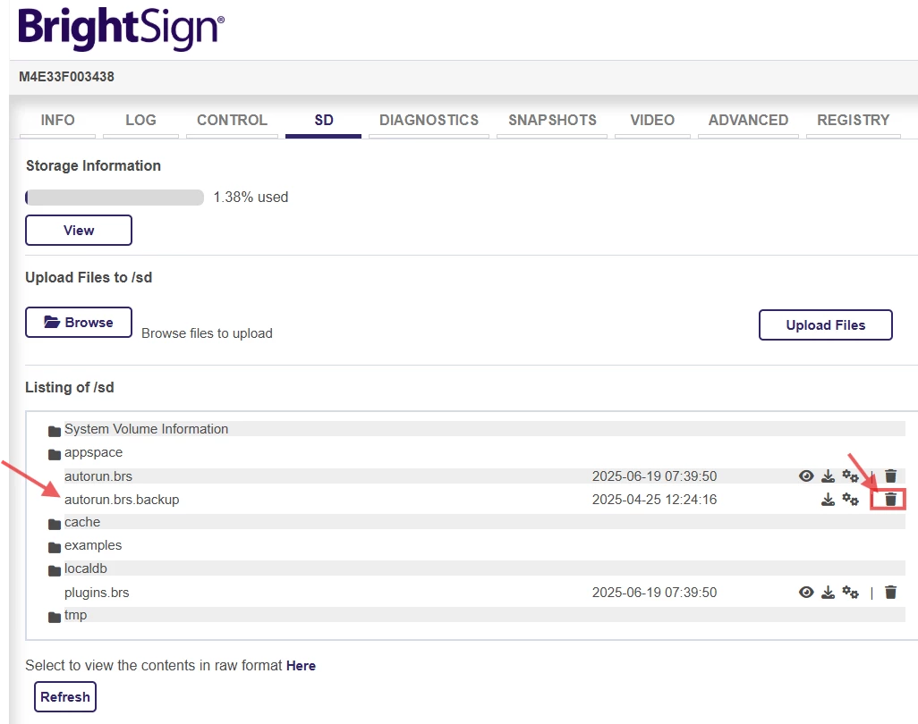 Go to the Brightsign Device page (http://<ip>:8080).
