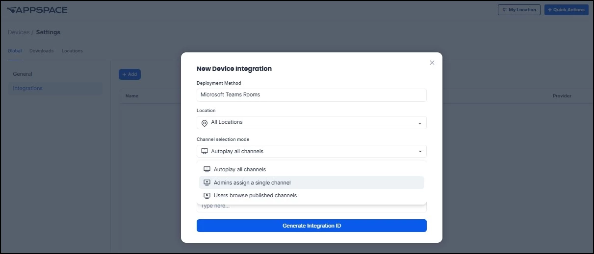 - Single Channel: When generating the MTR integration ID, select "Admins assign a single channel" under the Channel Selection Mode option. This ensures the MTR defaults to a known working playlist.