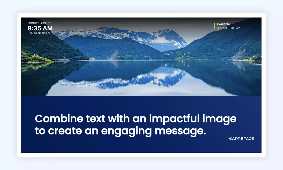 - Avoid complex scheduling. Since signage only appears when the device is idle, the device may never reach a scheduled content change if the room is in frequent use. Design your content assuming it could display for seconds or hours.