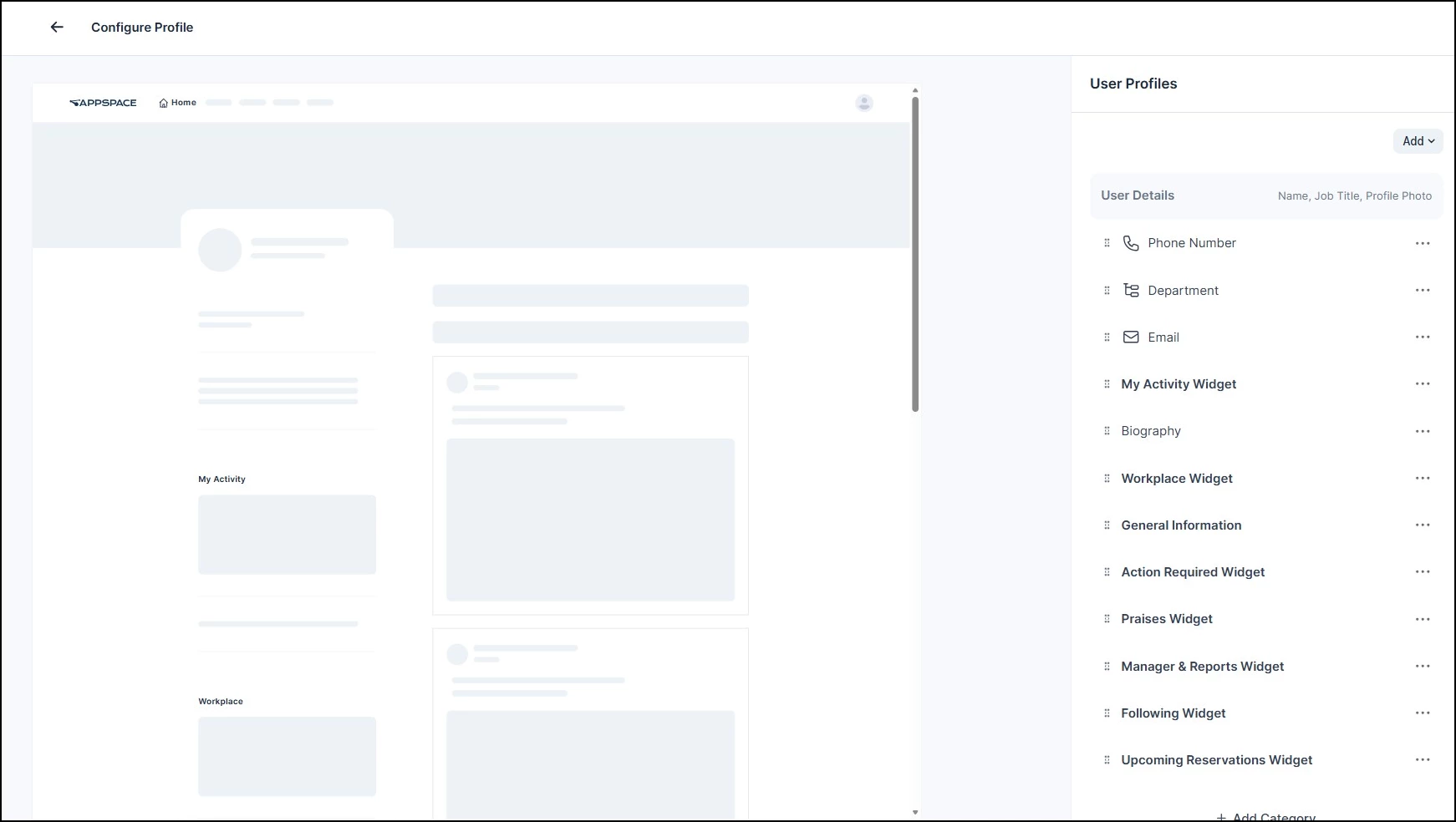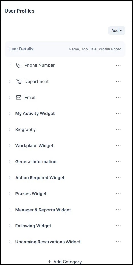 - Reorder items — Drag and drop fields, widgets, and categories to change their order on employee profiles.