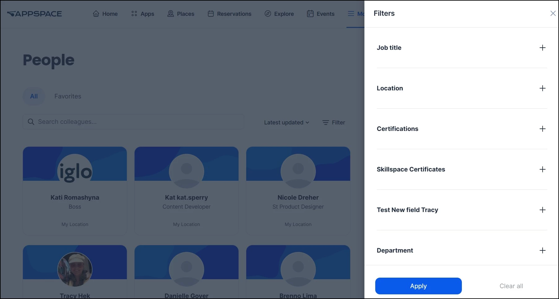 If an admin has enabled filtering for a custom field, the field will appear as a filter option in the People Directory right away. However, individual filter values only appear once at least one user has added that option to their profile. For example, if the “Certifications” field has filtering enabled but no employees have selected “First Aid” yet, that option will not appear in the filter list. Once an employee adds “First Aid” to their profile, it becomes available as a filter for all users.