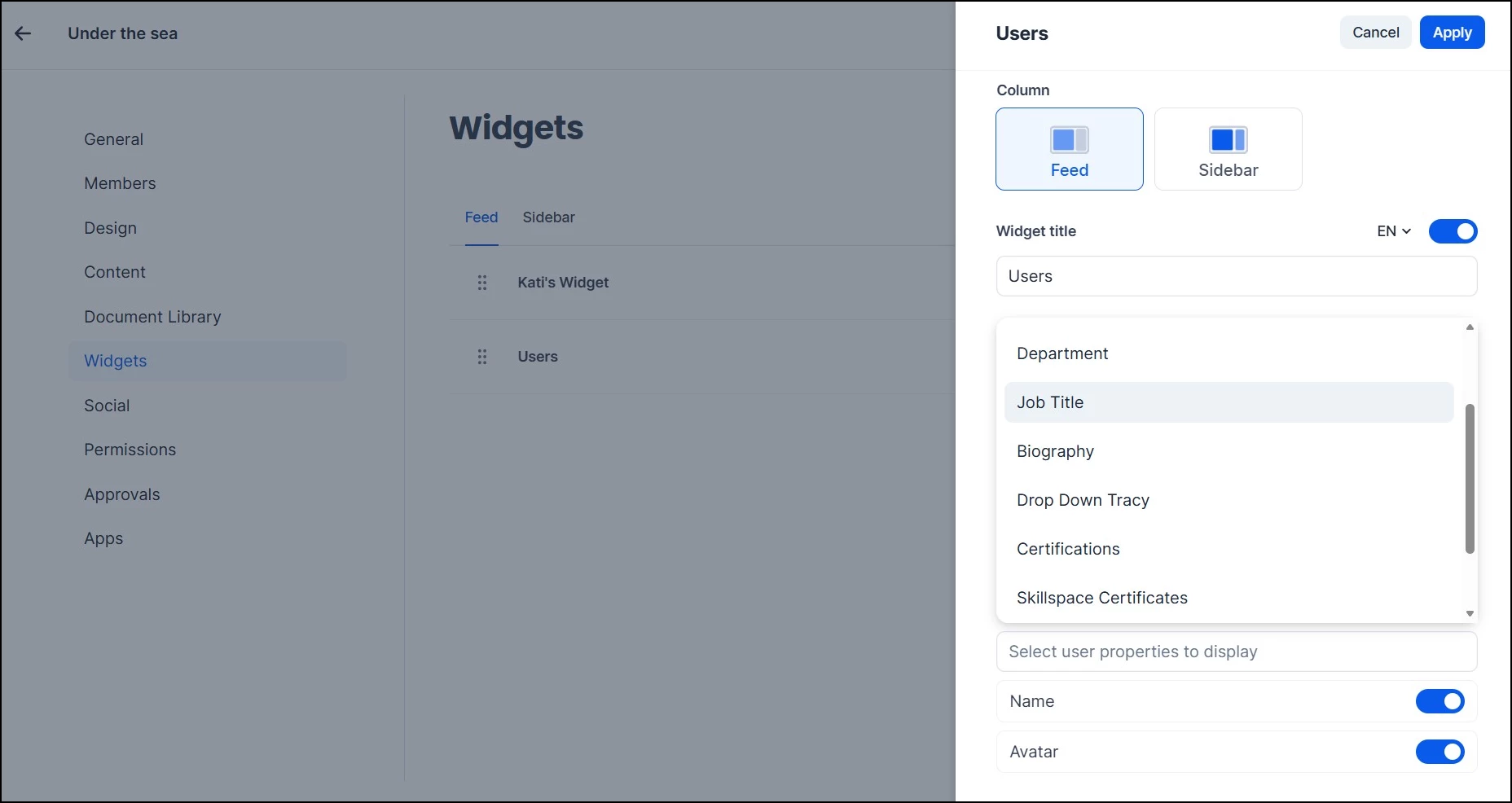 Custom profile fields created through the steps above are also available in the Users Widget for Spaces. When configuring a Users Widget, admins can choose to display any profile field (including custom fields like Certifications) alongside the users shown in the widget. This means the profile data you configure carries through to other areas of the platform, giving employees consistent and contextual information wherever they encounter colleague profiles.
