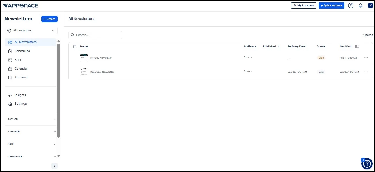 To access the module, click the ☰ Appspace menu and select Newsletter. Then, select a specific location from the dropdown menu to view or create Newsletters for a specific site.