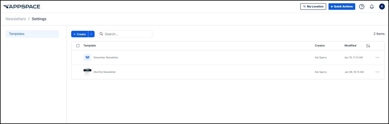 To establish a template, navigate to Newsletters > Settings > Create Template. Use +Create for additional designs or Import to bring in templates from another Appspace instance. o save a template externally, select Export from the (⋮) menu.