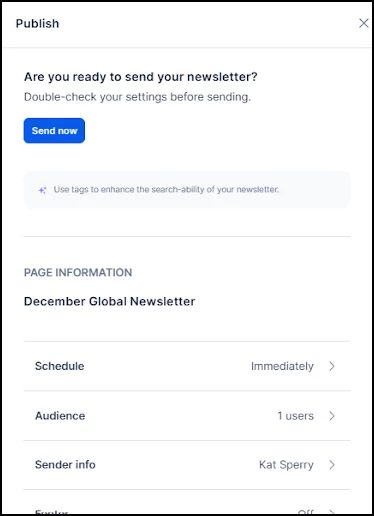 - Schedule: Set the newsletter to be sent immediately upon publication or schedule it for a specific date and time.