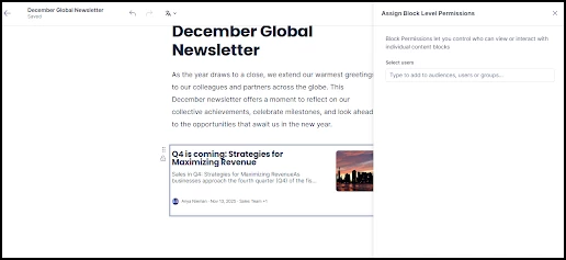 To restrict specific content to a targeted set of recipients, you can apply block-level permissions within the newsletter. This ensures that only authorized users see sensitive or role-specific content, even when the newsletter is distributed to a broad audience.