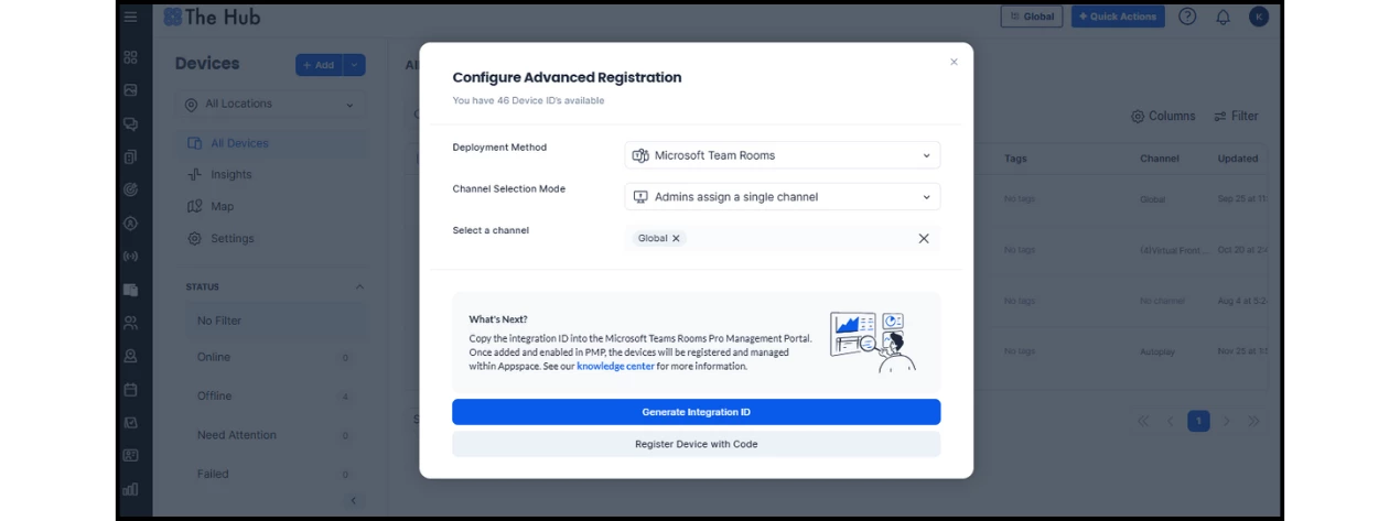 - Microsoft Teams Rooms devices are registered and enabled for digital signage integration.