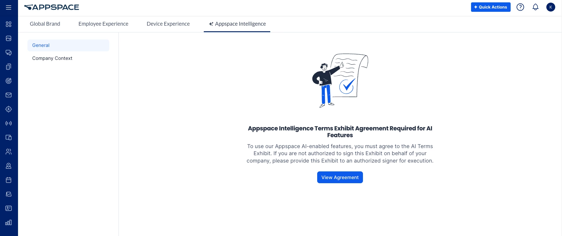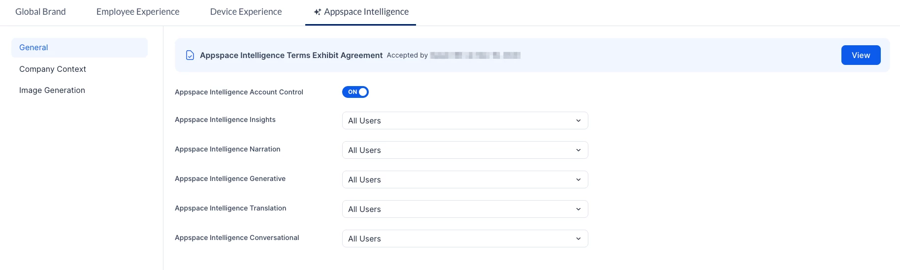 Before enabling Appspace Intelligence, review and accept the Appspace Intelligence Agreement. Once the agreement is accepted, the controls for the different Appspace Intelligence features will be available in the General tab.