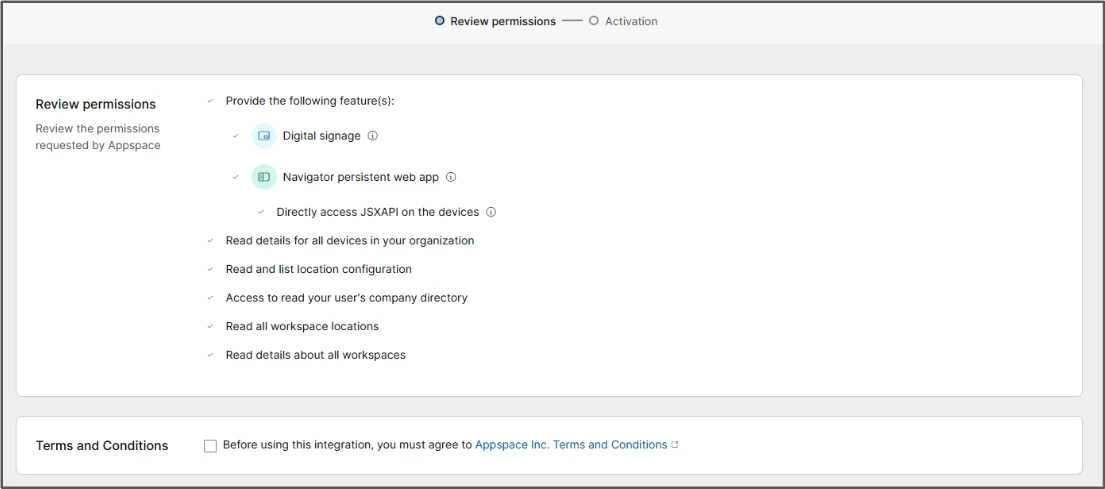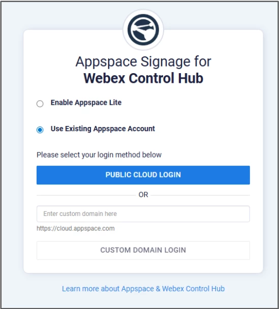 - Support for Per-User Cross Launch: Each individual user cross-launching from Control Hub into Appspace will be prompted to connect their Appspace account, allowing them to launch into Appspace with their own login and access