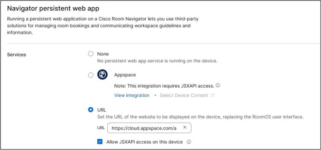 Note: Cisco Navigators that were using the Signage URL method in V1 will automatically continue using this method in V2. Your existing Navigator configurations are retained during migration. You can optionally update to the Appspace integration method later if desired.