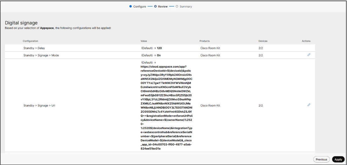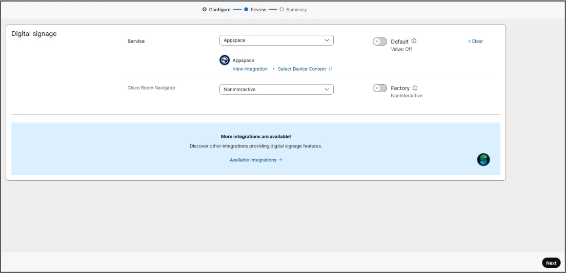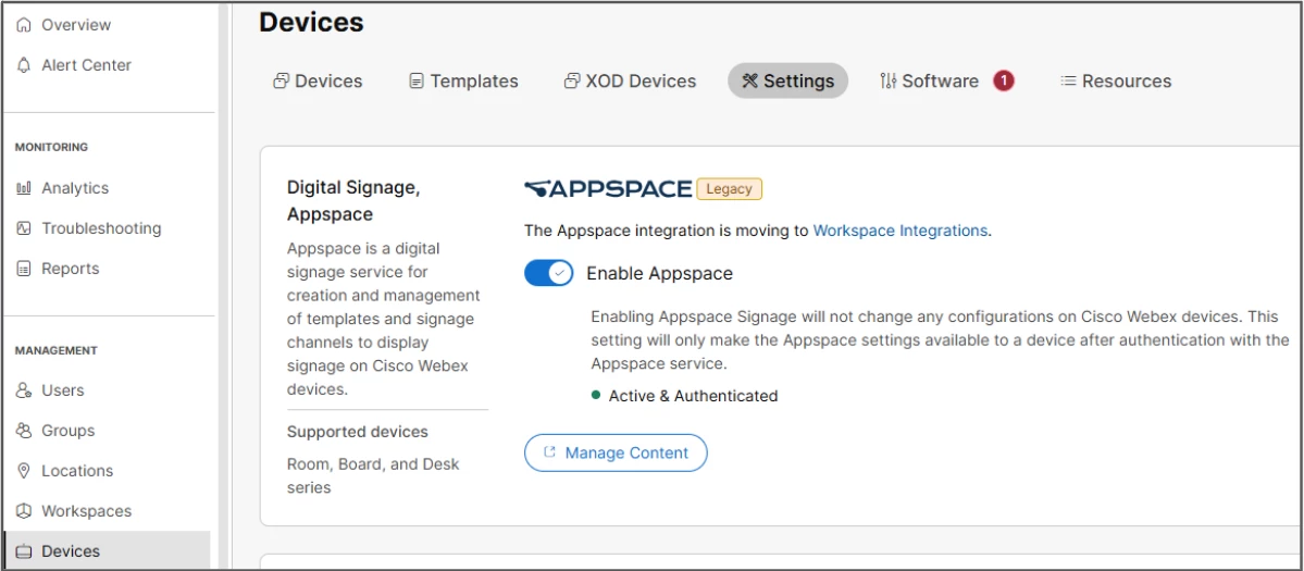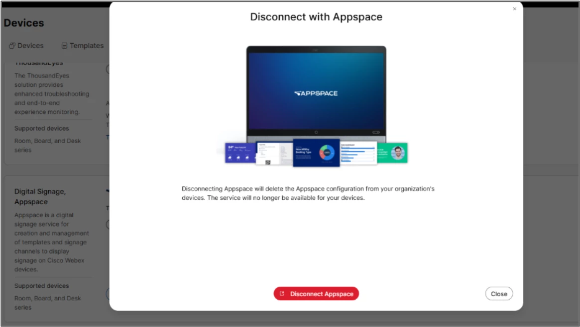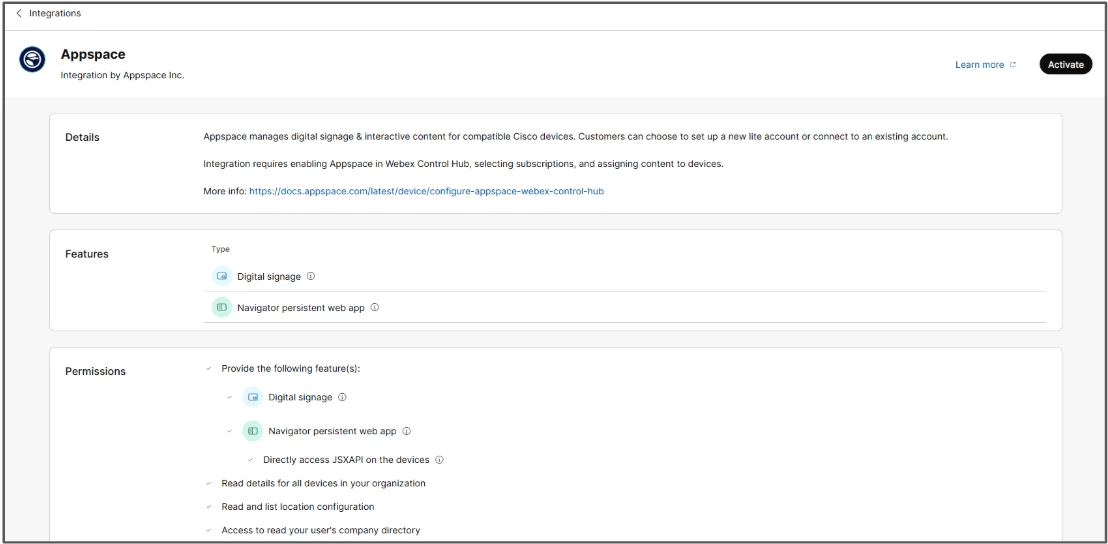 - Temporary Signage Mode Disruption: Upon disabling the V1 integration in Cisco Control Hub, all existing devices will temporarily lose their signage mode. Digital signage currently being displayed through Appspace on Webex devices will stop playing until the V2 integration is activated.