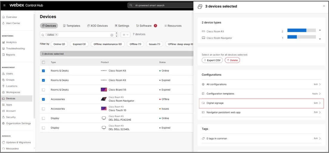 Yes. Webex Control Hub supports bulk assignment of signage mode. Select multiple devices and use the Edit menu to enable digital signage on all selected devices simultaneously.
