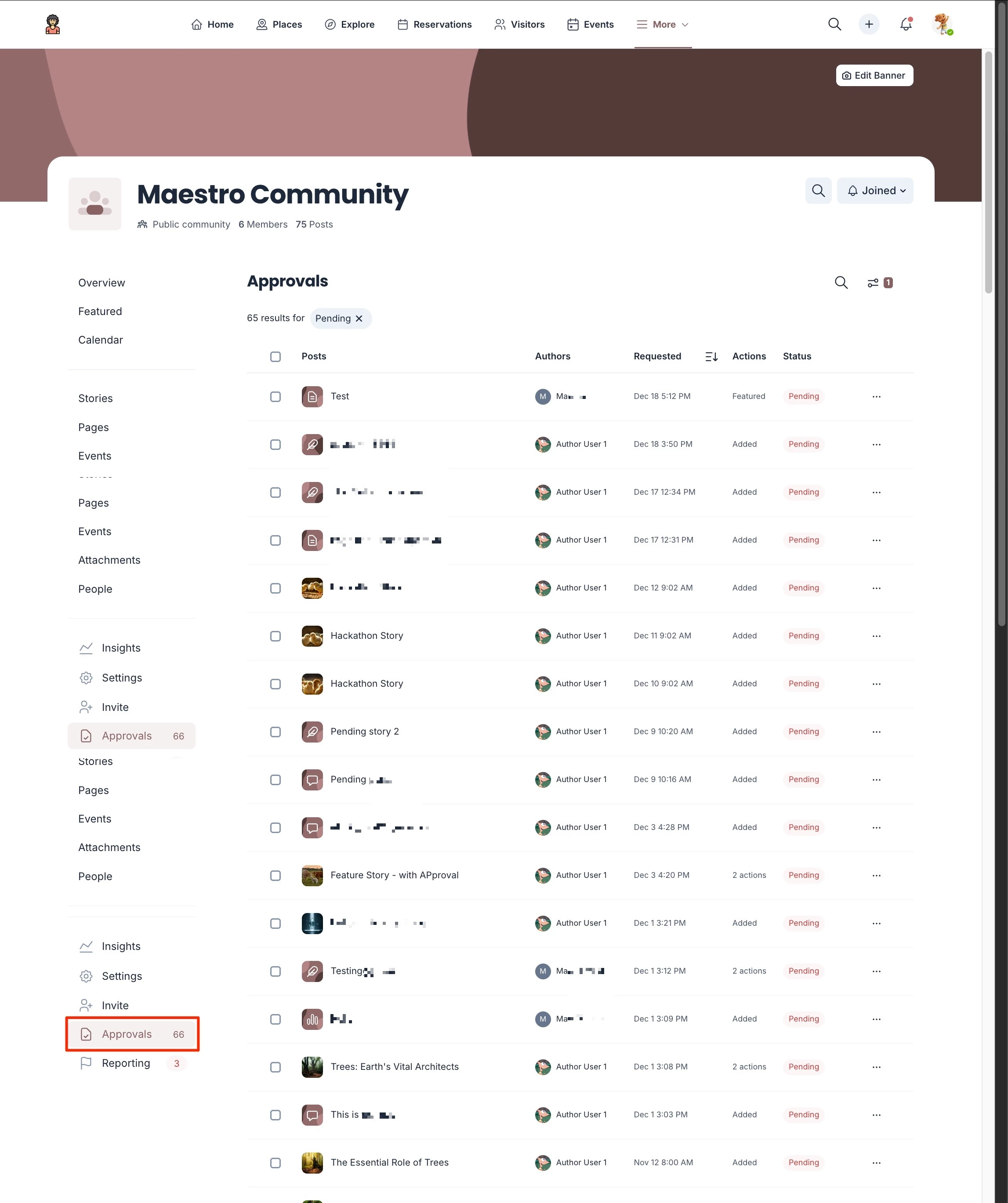 Perform the following actions to view and approve posts, pages and stories for a community: