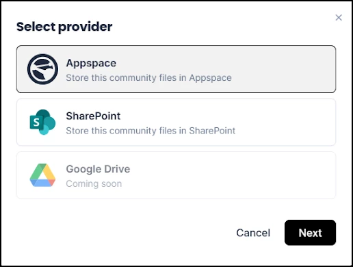 Important: Once created, a SharePoint Document Library cannot be converted to another library type without deleting and recreating it. The provider selection window also shows Appspace (for native storage) and Google Drive (coming soon) as options.