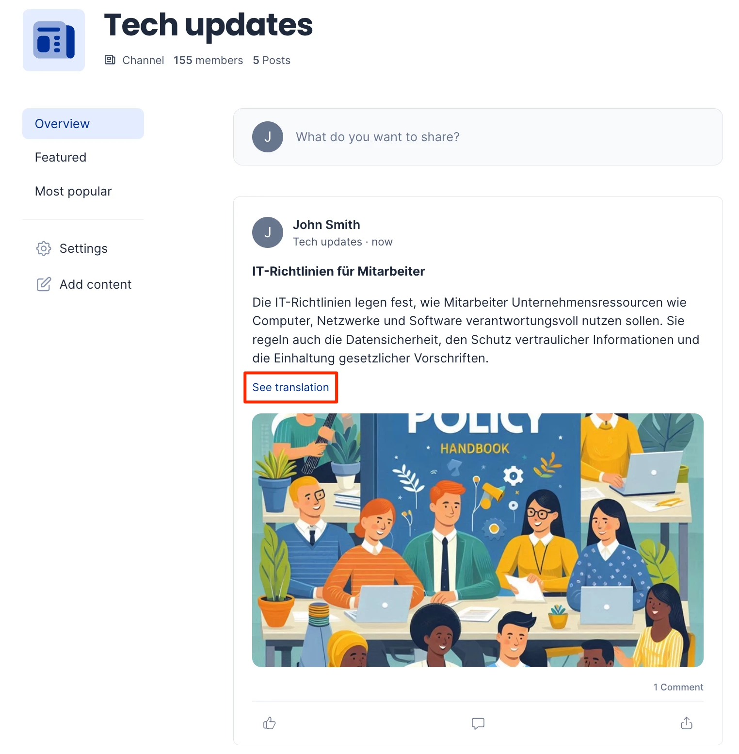 (New) Posts, event posts, polls, praises, and comments displayed to users with a different language setting in the Employee View will include a See translation option below the text. Users can click this option to view an auto-translation of the content. This feature requires the AI Translation setting to be enabled in the Administrative Console.