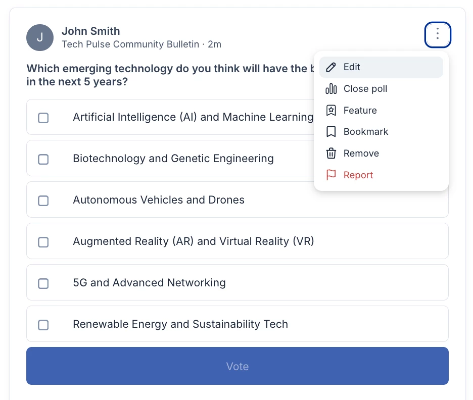 - Authors, Community owners, Community moderators, and Inherited owners can edit, delete, and close polls.