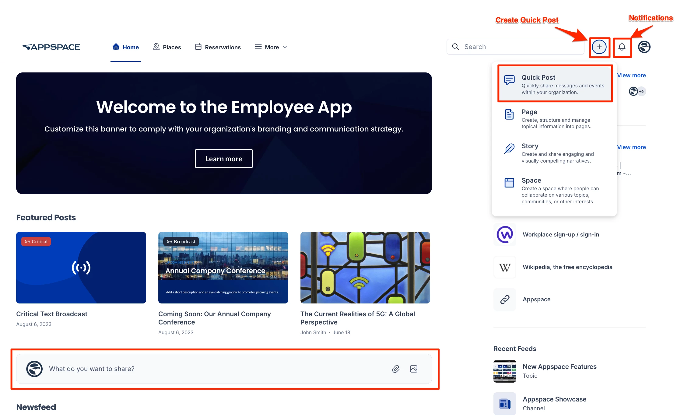 - On the Home tab, click the + sign next to the notifications bell button or click the “What do you want to share?” text box.