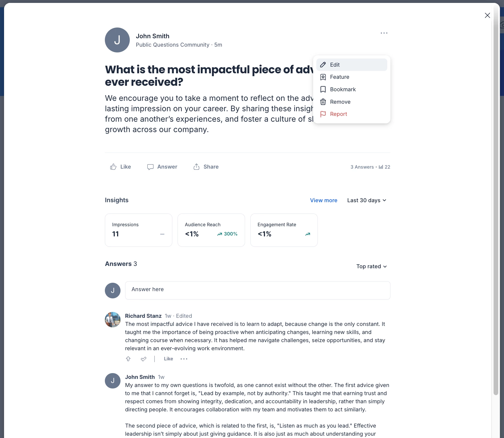 - Employees will be able to post their answers on the question card by clicking Answer. Once an answer is submitted, the card will display the total number of answers. This includes multiple answers from the same user.